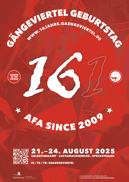16 Jahre Gängeviertel: Bildet Banden! Kunst, Diskurs, Festival, Konzerte, Club, Ausstellungen, Workshops, Lesungen, Performances, Spontanes und Unerwartetes vom 21. bis 24. August *** english below *** Bauspielplatz, Denkraum, Partykeller – das Gängeviertel gibt den Menschen dieser Stadt ein Wochenende lang, was sie gerade brauchen. Künstler*innen und Initiativen aus Hamburg, Leipzig, Berlin und vielen anderen Orten klemmen sich ihre Visionen unter den Arm, um unser Programm zu gestalten, Wissen weiterzugeben und auf den Putz zu hauen. Seid dabei! Kommt zum Gängeviertel Geburtstag vom 21. bis 24. August! „Bildet Banden“ lautet das Motto des diesjährigen Geburtstages. Wir wollen eigentlich immer ein Ort sein, an dem ihr euch finden könnt. An dem ihr Pläne schmieden und euch gegenseitig stark machen könnt. Das gelingt uns mal gut, mal nicht so. Aber eines ist sicher: Nur wenn wir zusammenhalten, können wir dem erstarkenden ABFUCK da draußen etwas entgegensetzen. Kommt in die Gänge und macht mit! Von Workshops über Lesungen zu Performances und einer Jam Session – unser Programm ist wie immer abwechslungsreich: Tunten Show, How To Twerk, Tox statt Detox – und das ist nur der Buchstabe T. Nach Lutscher-, Knutscher- und Flutscherhof wird der Kutscherhof in diesem Jahr zum Rutscherhof mit queeren Peformances, Kids Space und reichlich Raum für schwingende Pobacken. Unsere Brachenbühne liefert den Kontrast, wenn hier die Performance „How To Tox“ eine Anleitung zur Zerstörung des Selbstbewusstseins gibt. Der georgische Abend in der Jupibar soll die (Off-)Kultur der Menschen feiern, die in Tblissi seit vielen Monaten gegen die Repressionen der Regierung auf die Straße gehen. Auch unsere Galerien sind dabei: Im MOM art space zeigen Tausende Selbstporträts eines Gängeviertel-Aktivisten der ersten Stunde, wie machtvoll die Zeit ist. Im Raum linksrechts setzt sich der Künstler Vitor Aguiar spielerisch wie tiefgreifend mit politischer Identität, gesellschaftlichen Widersprüchen und ideologischer Verklärung auseinander. Gruppe Motto organisiert mit befreundeten Künstler*innen eine Artist Fair in der Speckstraße – mit Keramik, Fotodrucke, Lithografien, Zines. In der Galerie LADØNS spürt die Künstlerin Vasso Tzouti den verkörperte Spuren kollektiver Trauer nach. Das war noch nicht alles: Das Gängeviertel-Museum ist geöffnet. Es wird auch einen Rundgang zur subversiven Geschichte des umliegenden Quartiers geben. Der Kunstkiosk parkt für euch am Valentinskamp. Django Knoth schafft langzeitbelichtete Erinnerungen. Ihr könnt entdeckt werden bei der Maby Talent Show. Und es gibt auf diversen Flächen Livemusik – DJs, Bands, Jam Sessions – von Kostenfalle bis Blowjobs are Realjobs, von Alien Chicks bis Brass Riot, von Rock N Rosa bis I double m-o. Eine detaillierte Übersicht des Programms auf allen Flächen gibt es bald! Unser Awareness-Team ist an allen Tagen für euch ansprechbar. Be nice to each. So that we can be powerful together! ********** 16 Years of Gängeviertel: Form Gangs! Art, discourse, festival, concerts, club, exhibitions, workshops, readings, performances, spontaneity and the unexpected – August 21 to 24 Adventure playground, think tank, party basement – for one weekend, the Gängeviertel gives the people of this city exactly what they need. Artists and initiatives from Hamburg, Leipzig, Berlin, and many other places bring their visions to shape our program, share knowledge, and make some noise. Be part of it! Come celebrate the Gängeviertel’s birthday from August 21 to 24! “Form Gangs” is this year’s motto. We always aim to be a place where you can come together – to make plans, empower each other, and build community. Sometimes we succeed, sometimes we don’t. But one thing is certain: only by sticking together can we push back against the growing Bullshit out there. So come to the Gängeviertel and join in! From workshops and readings to performances and a jam session – our program is as diverse as ever: Drag shows, How to Twerk, Tox instead of Detox – and that’s just the letter T. After Lollipop Yard, Make-Out Yard, and Slip Yard, this year the Coach Yard becomes the Slide Yard – with queer performances, a kids’ space, and plenty of room for shaking booties. Our “Brachenbühne” offers contrast, with the performance „How To Tox“ – a guide to destroying self-confidence. The Georgian evening at the Jupibar celebrates the (off-)culture of people in Tbilisi who have been protesting government repression for months. Our galleries are also involved: At MOM art space, thousands of self-portraits by a founding Gängeviertel activist show the power of time. In Raum linksrechts, artist Vitor Aguiar explores political identity, social contradictions, and ideological distortion – playfully yet profoundly. Gruppe Motto is organizing an Artist Fair on Speckstraße with fellow artists – featuring ceramics, photo prints, lithographs, and zines. At Galerie LADØNS, artist Vasso Tzouti traces the embodied traces of collective grief. And there’s more: The Gängeviertel Museum will be open. There will be a guided tour on the subversive history of the surrounding neighborhood. The Kunstkiosk will be parked for you at Valentinskamp. Django Knoth creates long-exposure memories. You might be discovered at the Maby Talent Show. And there will be live music across various stages – DJs, bands, jam sessions – from Kostenfalle to Blowjobs are Realjobs, from Alien Chicks to Brass Riot, from Rock N Rosa to I double m-o. A detailed overview of the program for all areas will be available soon! Our awareness team will be available for you every day. Be nice to each other. So that we can be powerful together!
