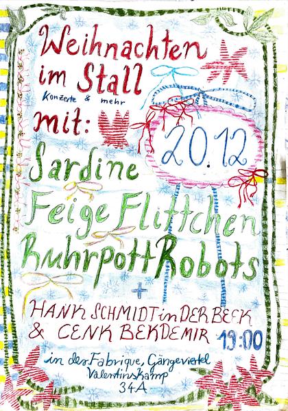 Die Ohren läuten, die Hände klatschen, die Münder grinsen. Das kann nur eins bedeuten, es ist Weihnachten im Stall im Dezember in der Fabrique im Gängeviertel: eine Veranstaltung der Bands Ruhrpott Robots, Sardine und Feige Flittchen! Die Hamburger Bands laden herzlich ein zu ihrem fantastische Winter-, und Weihnachtsspaß mit und ohne Schuss. Es gibt Punk und Punsch und Plätzchen, sowie eine Chance den Stargast Hank Schmidt in der Beek vom Lunsentrio live zu sehen, der uns durch den Abend leiten wird: Oi! Oi! Oder wie man bei uns im Weihnachtsstall sagt… Hoi! Hoi! Doors: 19:00 Uhr Spendenempfehlung: 15€