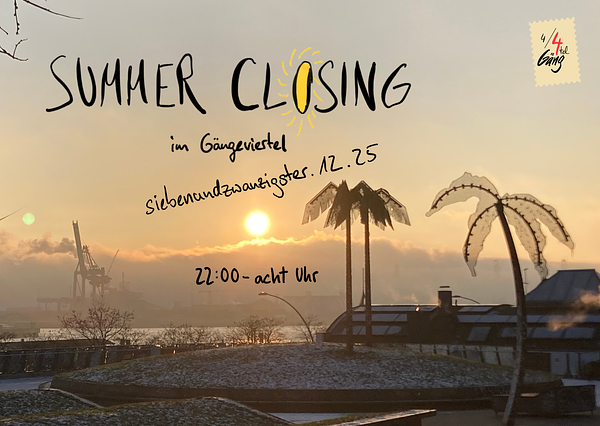 Die 4/viertel Gäng lädt ein zum alljährlichen Summer Closing. Die letzte Chance des Jahres soll genutzt werden, um alle Freunde zu versammeln und 2025 ausklingen zu lassen. Mit unseren Freunden von 60 Zoll aus Hannover werden wir nochmal feiern als wäre Juni, um dann in den Winterschlaf zu fallen. Musik: bei feinstem Sound auf zwei Floors, von Sommer Vibes über Electro bis Progressive kommt jede auf ihre Kosten! Außerdem: versendet Postkarten an eure Liebsten aus dem Kurzurlaub Summer Closing.