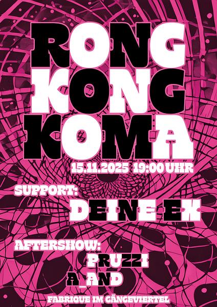 Rong Kong Koma Pop-Colère Zu verspielt für Punk, zu dreckig für Indie, zu wütend für Pop - das sind Rong Kong Koma.Reibeisenstimme und treibendes Schlagzeug treffen in Hochspannung auf filigran-ballernde Gitarren und einen hüpfenden Bass.„Die härteste Band im Pop. Die softeste Band im Punk.Sie sind all das, was andere Bands nicht sein wollen.Eingängige Songs, maximal schrammelig und punkig gespielt. Ohrwürmer mit Ecken und Kanten.Dazu rotzfreche Texte, für die man jederzeit eine Tracht Prügel kassieren könnte – oder eine Umarmung.“ (OX)Rong Kong Koma sind eine hochenergetische, bunte Live-Band mit komplexen Violent-Pop-Superpower-Songs aus Berlin. Deine Ex die Punkband mit mehr Krach als ein WG-Streit um das letzte Klopapier. Seit Gründung im Februar 2023 verbreiten sie in Hamburg musikalischen Liebeskummer, der lauter ist als deine letzte Trennung. Sie laden zum hemmungslosen Tanzen und Mitsingen ein, gerne auch schief - Hauptsache laut! Unvergesslich wie kalte Pizza am Morgen danach! Pruzzi, ohhhh lieber Pruzzi, heilige drei Akorde. <3 Urgestein der Szene begann 1997 mit Hip-Hop Vinyl zu sammeln. Von Hip-Hop, D`n`B, Reggae, Punk und diverser elektronischer Musik, kaufte er sich alles was ihm gefiel. Seit 2024 auch wieder als "Pruzz" am Drum´n´Bass und als "Pruzzi" am Punkrock auflegen! Floorfreude steigt. ...weiter gehts.... a_and nur wenn keiner von euch am Tresen pennt...;)