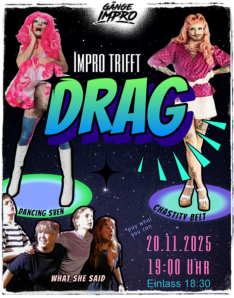 Am 20.11.2025 geht "Impro trifft..." in die zweite Runde und wir treffen auf DRAG! Ganz vorne dabei sind an dem Abend die zwei wundervollen, iconic Drag Queens Dancing Sven und Chastity Belt mit tollen Drag Acts. Die Flinta Impro Truppe What She Said wird dann, inspiriert von dem jeweiligen Act, Szenen auf die Bühne zaubern. Es wird frivol, es wird queer, es wird hot! 20.11.2025 (Donnerstag) 19:00 Einlass 18:30 Pay what you can Gängeviertel (Saal in der Fabrique, so wie immer)