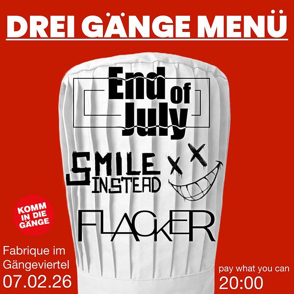 End of July: End of July ist eine junge Indie-Rockband aus Hamburg. In klassischer Rockbesetzung verbindet sie seit 2023 energiegeladenen Rock mit modernen Einflüssen und souligen Vocals. Die Live Shows nehmen einen mit auf eine Reise von fetzigen, energiegeladenen Riffs zu gefühlvollen Slow Jams. spfy:https://open.spotify.com/artist/3xznEDlBeFrugQbXOtY6Oi?si=CSLHCsGlSn-lkif5WnpaLA Flacker: Die Band FLACKER aus Hamburg macht erfrischenden Punk-/Indierock mit deutschen Texten. Die Musik klingt, als hätten Kraftklub, Wir Sind Helden und Paramore eine tagelange Party gefeiert. FLACKER ist für diejenigen, die tanzen, aber auch zuhören wollen. spfy:https://open.spotify.com/artist/3zQSmPoicKfUFo70Ttx8IA?si=dnuTi8roRA-ECMFscNs0VQ Smile Instead: Smile Instead macht Heavy Pop-Punk mit bisschen Indie und Hardcore Einflüssen. Kommt rum,schreit mit und tanzt mit uns. Spfy: https://open.spotify.com/artist/23i2ii2imcUDLQGsvRzIZY?si=zUyJnMliRb6e-gVwgAOoVQ