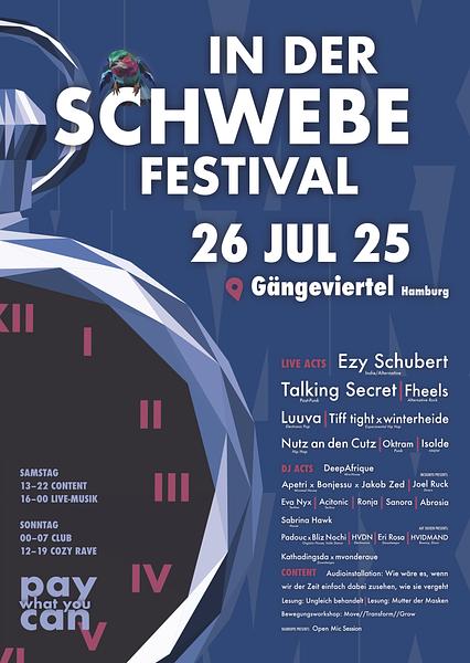 IN DER SCHWEBE geht in die fünfte Runde. Es wird Zeit für ein Jubiläum. Samstag 26.07. um 13 Uhr geht das bunte Treiben im Gängeviertel los und am Sonntag 27.07. um 19 Uhr kehrt wieder ruhe ein. Dieses Mal auf fünf Flächen des Gängeviertels mit noch mehr vielfältiger Musik und Programm von diversen Menschen mit unterschiedlichen Genres und Themen im Gepäck. Kommt vorbei und schwebt mit uns! Content auf der Brache: Samstag 13.00 – 22.00 Mit: Lesungen, Audioinstallation, Bewegungsworkshop Live-Musik im Wäldchen: Samstag 16.00 – 22.00 Mit: Nutz an den Cutz Showcase, Isolde, Ezy Schubert, DEEPAFRIQUE Live-Musik im Saal der Fabrique Samstag 18.00-24.00 Mit: Talkin’ Secret, Tiff tight x winterheide, Fheels, Luuva Open Mic und Kunstaustellung in der Jupibar (Raubkopie) Samstag ab 19.00 Clubnacht in Saal und Keller (Incognito) Samstag 23.30-07.30 Mit Acitonic, Jakob Zed b2b Bonjessu, Eva.Nyx, Joel Ruck, Ambrosia, Sabrina Hawk, Apetri b2b Sanora Cozy Rave im Wäldchen (Auf Socken in die Gänge) Sonntag 12.00 - 19.00 Mit Kathadingsda b2b mvonderaue, Eri Rosa, HVDN, HVIDMAND, Padouc b2b Bliz Nochi Kommt und feiert mit uns durch die Zeit.